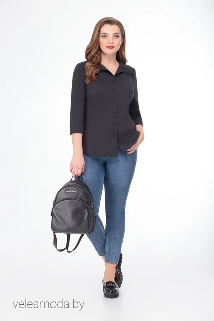 Блузка женская полуприлегающего силуэта, с втачным воротником рубашечного типа, с центральной бортовой застёжкой на петли и пуговицы, с нагрудными и талиевыми вытачками. Рукав втачной, широкий, длиной ¾, с отложной манжетой. Блузка длиной до линии бедер, с закруглённым низом.