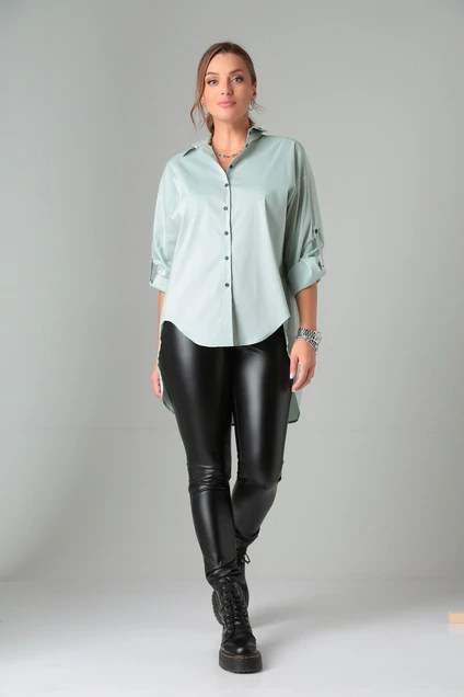 Рубашка в стиле оверсайз дополнит любой ваш образ с шортами, брюками и легинсами, с легкостью позволяет скрыть недостатки фигуры и подчеркнуть её достоинства. Эффектный образ создается за счет необычных деталей и элементов. Воротник и чёрные пуговицы фишка этой рубашки. По спинке имеется кокетка с декоративными элементами. Мятная рубашка– это не только стильно, но и эффектно, а ещё и удобно. Добавляем эту рубашку к любому “низу” образ готов. Модель OverSize.