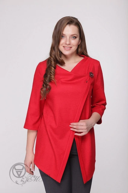 Длина кардигана по спинке 75 см Длина рукава 44,5 см Женский блузон свободного силуэта с ассимитричным запахом,который фиксируется съемной брошью.Спинка расширенная к низу.Рукава втачные длинные.