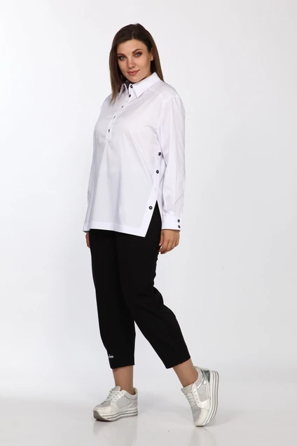 Стильная женская блузка, выполнена из хлопковой ткани. Свободного силуэта. По переду, отрезные кокетки, планка ниже уровня груди с застежкой на петли пуговицы, низ планки украшен металлической нашивкой. По боковым швам фигурные разрезы с пуговицами. Горловина оформлена рубашечным воротником на стойке. Рукава рубашечные, длинные по низу манжет с застежкой на петли-пуговицы.