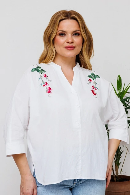 Повседневная блузка прямого кроя. По переду декоративная планка с пуговицами. Рукав укороченный цельнокроенный. На блузке расположена дизайнерская вышивка.