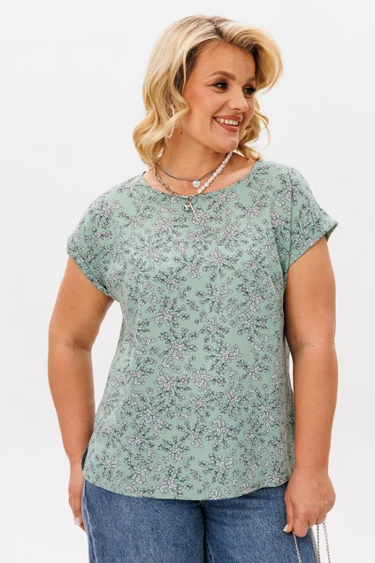 Блузка лаконичная с цельнокроеным коротким рукавом и с круглым вырезом горловины. В боковых швах разрезы.