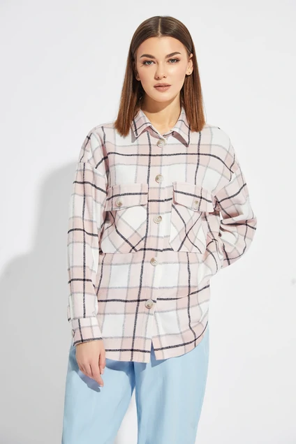 Рубашка прямого силуэта со спущенным плечом с втачным рукавом с монжетой. Полочка с застежкой на петли-пуговицы по цельнокроеной планке, с крупными карманами с клапаном и декоративной пуговицей. Рубашка с отложным воротником на стойке. Спинка с кокеткой.