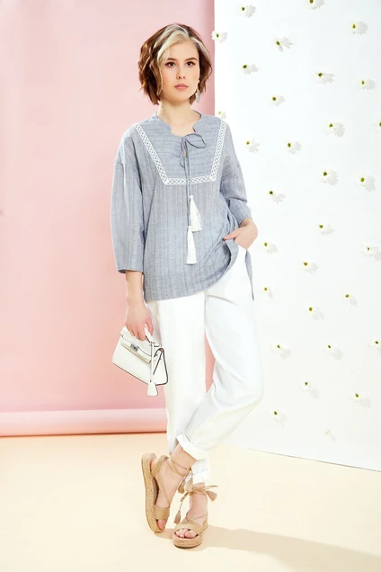 Рубашка прямого силуэта , втачного покроя со спущенной линией плеча. Рукав 7/8 с притачной манжетой. Боковой шов смещен на перед. Низ рубашки фигурный, спинка длиннее переда. Вырез горловины круглый со стойкой. По переду обработана" капля", в шов обтачивания которой вставлены завязки.По шву притачивания вставки переда настрочена тесьма.