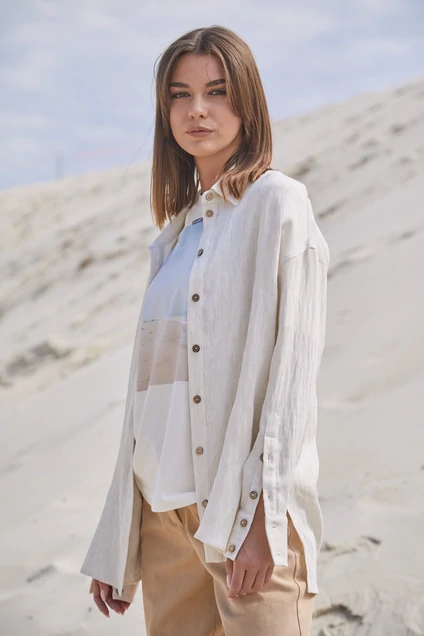 Рубашка свободного силуэта со спущенной линией плеча и втачным одношовным рукавом с манжетой и планкой. По переду центральная застежка по планке на петли и пуговицы. Рубашка с воротником рубашечного типа на стойке. По бокам рубашки обработаны разрезы, перед короче спинки.