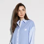 Блузка прямого силуэта, двухцветная. Рукав втачной одношовный, внизу со складкой и манжетой, с застежкой на петли-пуговицы. Полочка с центральной застежкой на петли-пуговицы. По левой полочке нагрудный карман. Воротник рубашечный отложной на стойке. По спинке кокетка. Внизу по боковым швам обработаны разрезы.