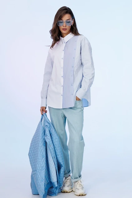 Блузка 3-цветная, прямого силуэта, со спущенной линией плеча. Рукав втачной одношовный, внизу со складкой и манжетой с застежкой на петли-пуговицы. Полочка с центральной застёжкой на петли-пуговицы, и со смещенной планкой с имитацией застёжки. Спинка с кокеткой. Воротник рубашечный отложной на стойке. Спинка и полочка с фигурным низом. Внизу по боковым швам обработаны разрезы.