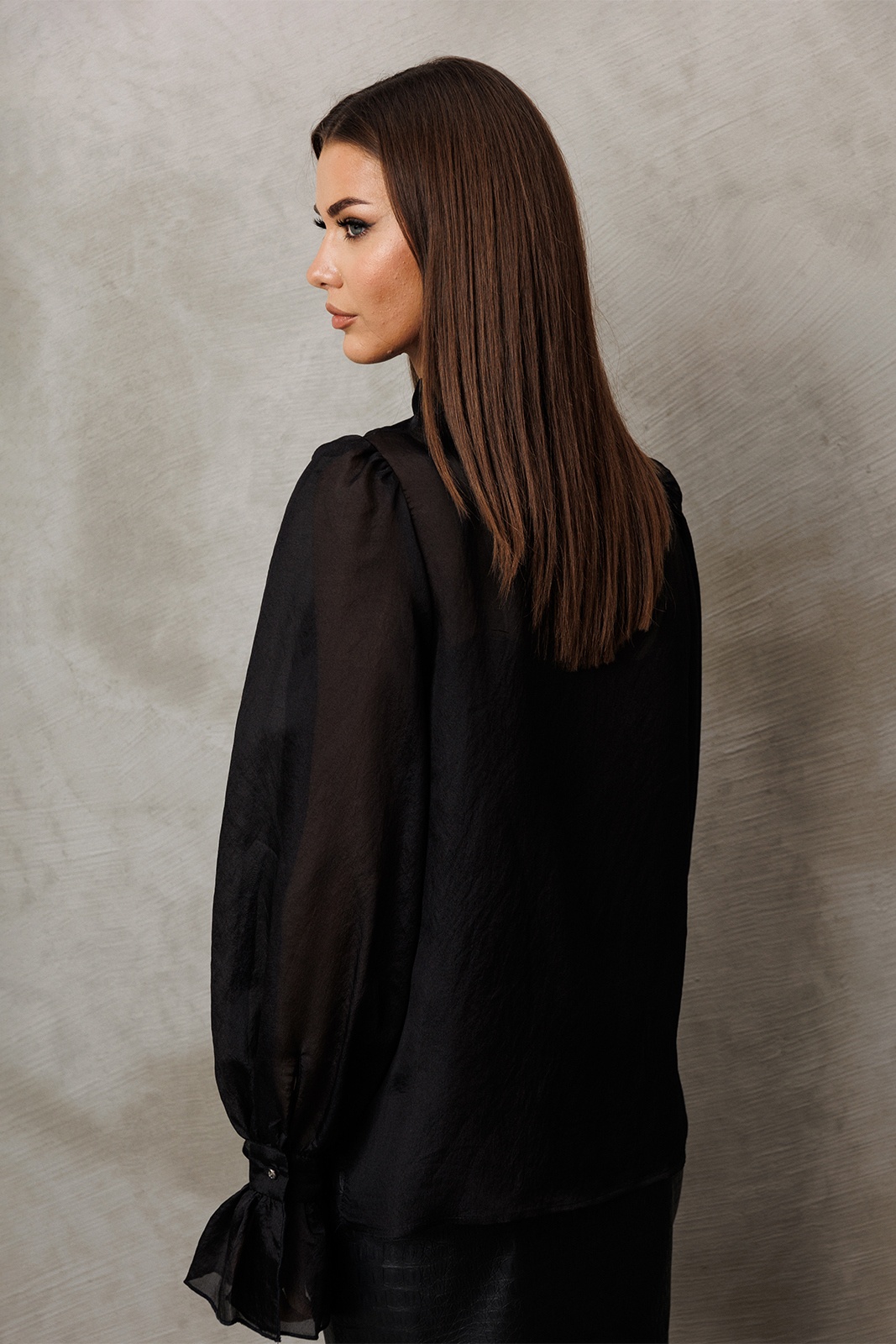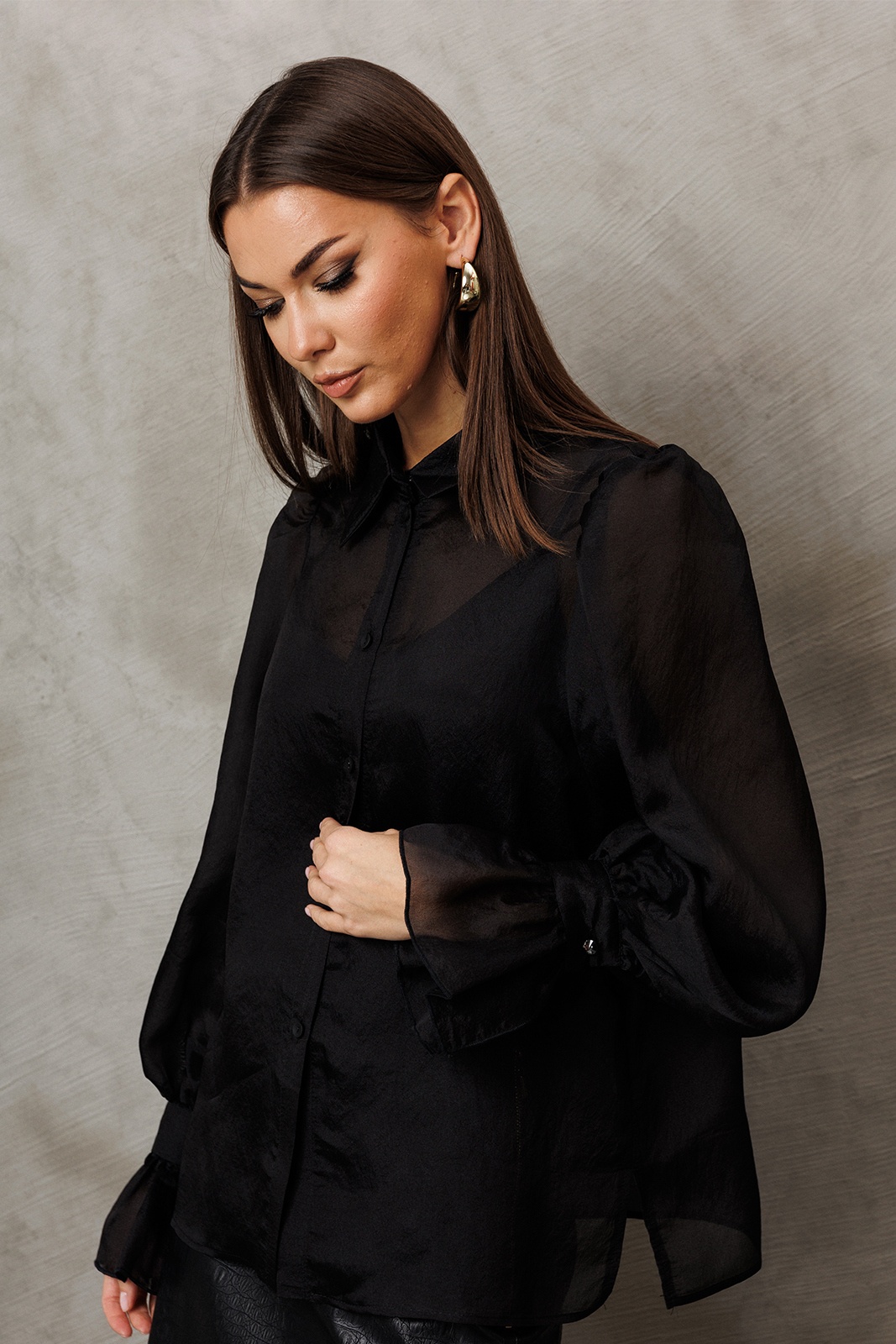 Блузка из креп-шифона с напылением. Прямого силуэта, с втачным рукавом вверху со сборкой внизу на манжете с застежкой на петлю пуговицу и рюшей от манжеты. Полочка с центральной застежкой на петли-пуговицы на цельнокроеной планке. Воротник рубашечный отложной на стойке. Внизу по боковым швам обработаны разрезы. К блузке идет в комплекте атласный топ на регулируемых бретелях. Прямого силуэта. Вверху на широкой обтачке. Полочка с V-образным вырезом и нагрудной вытачкой.