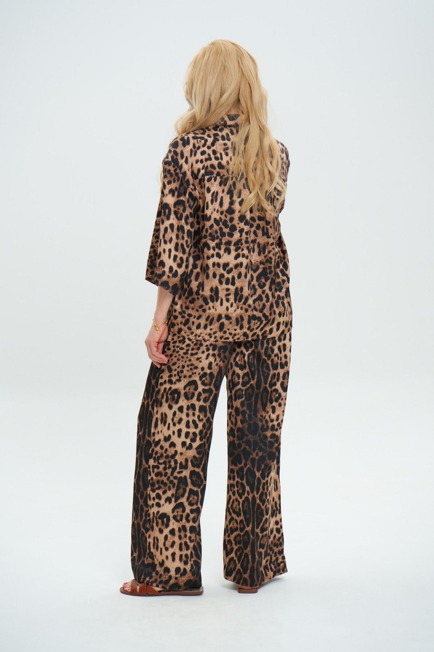 Откройте для себя блузу в леопардовом принте, которая станет ярким акцентом вашего гардероба. Этот изысканный предмет одежды выполнен в темных оттенках с коричневыми и черными пятнами, что делает его идеальным выбором для смелого и запоминающегося образа. Блуза имеет прямой силуэт, что обеспечивает свободу движения и комфортное ношение. Дизайн блузы включает отложной воротник со стойкой, придающей аккуратный и структурный вид. По спинке предусмотрена изящная бантовая складка и двойная притачная кокетка, добавляющие изысканности. Размещенный на передней части притачной планке с застежкой на пуговицы удобен для регулировки посадки. Рукав блузы втачной и расклешенный, придавая легкость и воздушность облику. Приспущенное плечо подчеркивает расслабленный стиль. Эта блуза идеально сочетается с брюками или юбками, создавая стильный и современный ансамбль. Подходит для различных случаев: от деловых встреч до неформальных мероприятий.