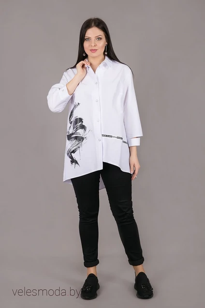 Рубашка прямого силуэта из хлопка. Низ изделия асимметричен. По переду сквозная застежка на петли и пуговицы. Правая часть переда с абстрактным принтом, левая декорирована тесьмой с буквами. Рукав втачной, с манжетой.