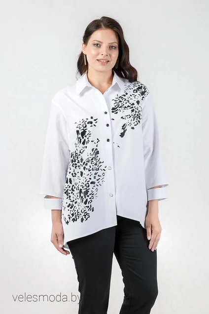 Рубашка прямого силуэта из хлопка. Низ асимметричный. По переду нагрудные вытачки, сквозная застежка на петли и пуговицы. Правая и левая часть переда с абстрактным анималистическим принтом. Спинка с кокеткой. Рукав втачной, длиной 3/4, с частично притачной манжетой.
