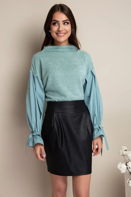 Джемпер из мягкого вязанного трикотажа в комбинации с хлопчатобумажной тканью. Перед и спинка изделия - из вязанного трикотажа с цельнокройной стойкой, линия плеча спущена. Объемный рукав из хлопка со складками и рюшей по низу фиксируется на запястье сборкой на резинку-модельку и завязками.