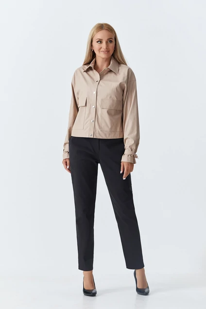 Кожаная рубашка ,выполнена из высококачественной эко-кожи на вискозной основе, прямого свободного силуэта. Низ изделия фигурный, спинка по отношению к переду слегка удлинена. По переду центральная застежка на кнопки и накладные карманы с клапанами. Горловина округлая с втачным воротником-стойкой рубашечного типа. Спинка цельная, линия плеча приспущена. Рукав втачной длинный, по низу рукава расположены шлёвки с декоративной завязкой , которая позволяет фиксировать нужный объём .