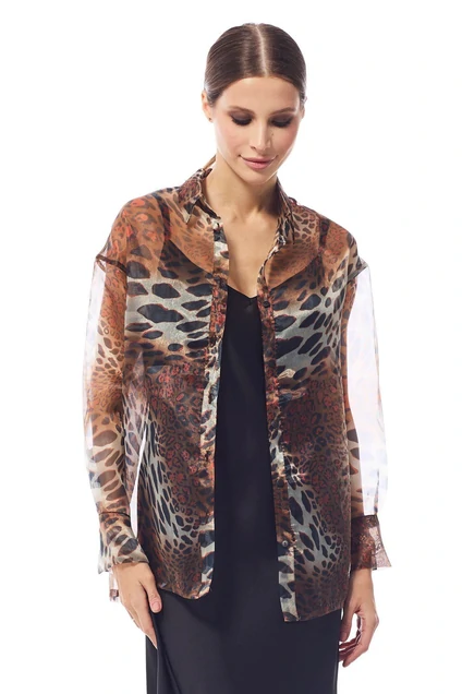 Блуза женская , выполнена из принтованной органзы .Рукав втачной одношовный с притачной манжетой. Воротник рубашечный , застежка центральная на петли и пуговицы .