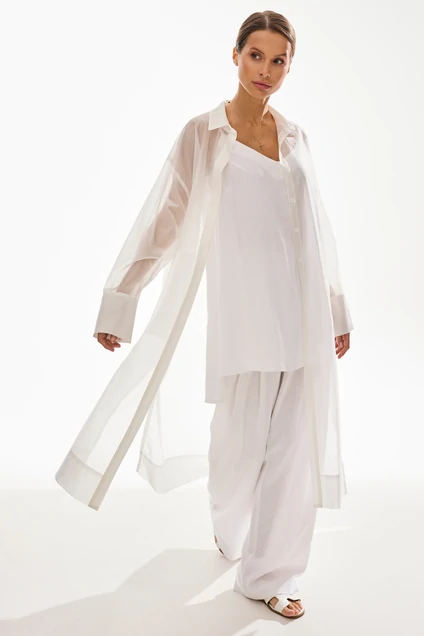 Блузка женская , удлиненная , свободного силуэта . Выполнена из блузочной вискозной вуали высокого качества . Застежка центральная на петли и пуговицы .Воротник и рукав рубашечного типа с планкой и притачной манжетой . По спинки двойная кокетка со складками . По боковым швам высокие разреры , подгибка низа широкая с закрытым срезом .