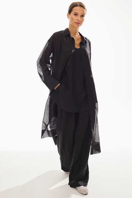 Блузка женская , удлиненная , свободного силуэта . Выполнена из блузочной вискозной вуали высокого качества . Застежка центральная на петли и пуговицы .Воротник и рукав рубашечного типа с планкой и притачной манжетой . По спинки двойная кокетка со складками . По боковым швам высокие разреры , подгибка низа широкая с закрытым срезом .