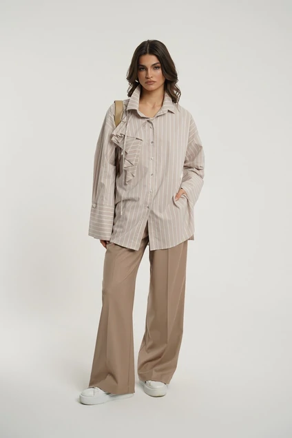 Блуза из хлопковой ткани свободного покроя. Воротник рубашечный, застежка на петли и пуговицы. Рукав отрезной на базе цельнокроеного с широким манжетом по низу. Изделие дополнено съемным декоративным элементом.