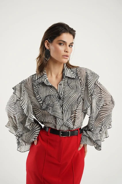 Блузка из шифона прямого силуэта. Воротник рубашечный, по переду отрезные планки с воланами и застежкой на петли и пуговицы. Рукав втачной объемный, с воланами, вставленными в декоративный подрезы. Низ рукава присборен на манжету с застежкой на пуговицу. В боковых швах разрезы.