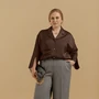 Блузка женская свободного силуэта из атласной ткани. Вырез горловины оформлен воротником пиджачного типа с застежкой на петли с пуговицами. Рукава- отрезные на базе цельнокроеных с отрезными манжетами с разрезами. В боковых швах выполнены разрезы. Передняя половинка декорирована настрочным декоративным элементом.