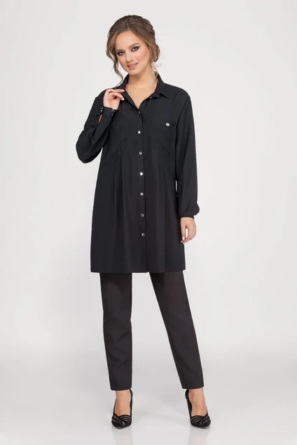 Блуза прямого силуэта с центральной застежкой с планками на 8 прорезных петель и пуговиц. Перед с нагрудными вытачками, накладными карманами, с подрезами, со складками по нижним деталям. По низу боковых швов высокие разрезы. Рукава длинные одношовные с притачной по низу манжетой, застегивающейся на 2 прорезные петли и пуговицы. Воротник рубашечного типа с отрезной стойкой, застегивающейся на 1 прорезную петлю и пуговицу.