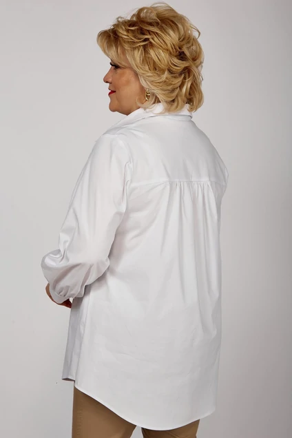 Блуза свободного силуэта. Воротник отложной на стойке. По переду центральная застежка на 3 петли и 3 декоративные пуговицы. По бокам блузы выполнены разрезы. Спинка на кокетке. От кокетки выполнена сборка по центру. Рукав свободный на манжете на две пуговицы.