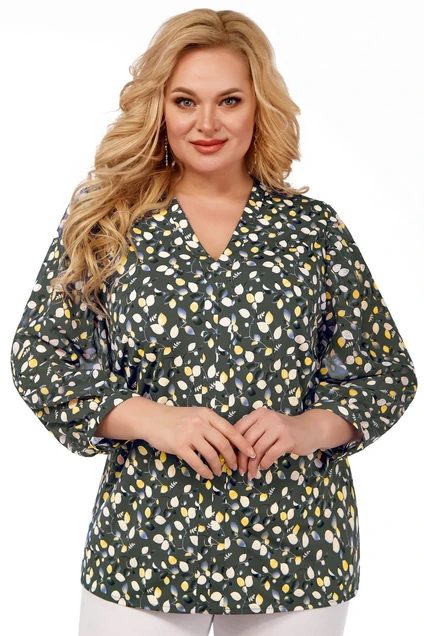 Универсальная базовая блузка прямого силуэта из легкой принтованной ткани. По переду вытачки нагрудные. Вырез горловины V-образный, не глубокий, параллельно переходящий в настрочную планку. Рукав втачной, из креп-шифона, низ обработан притачной манжетой. В боковых швах предусмотрены фигурные разрезы