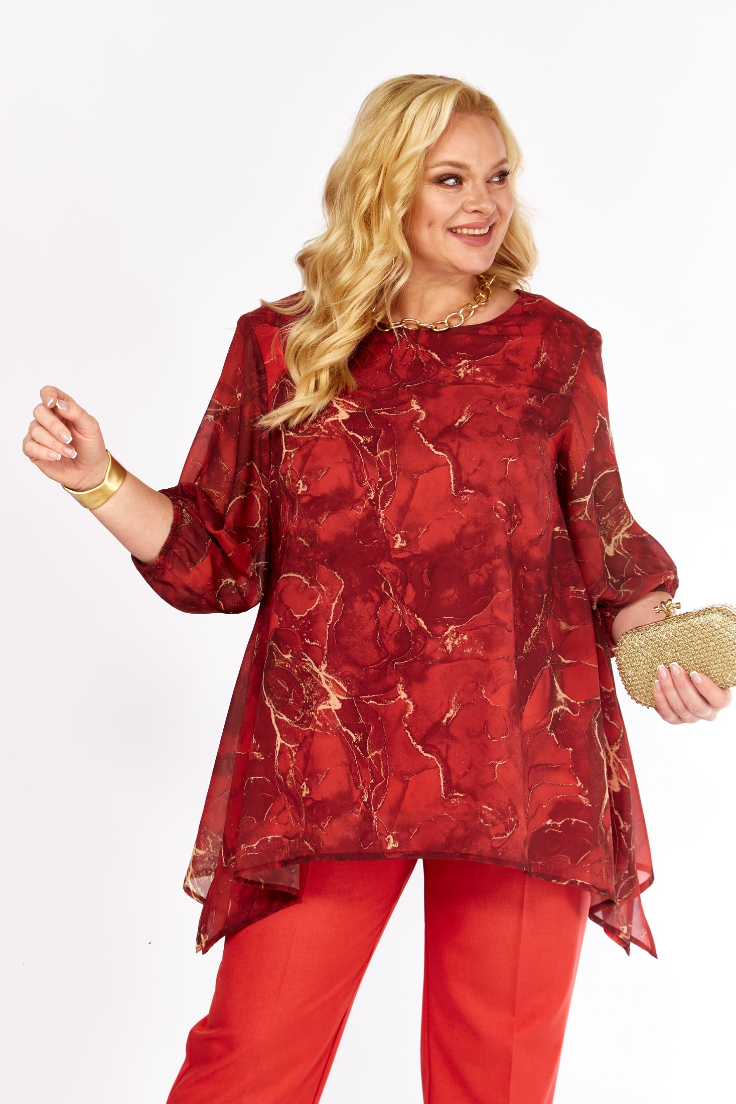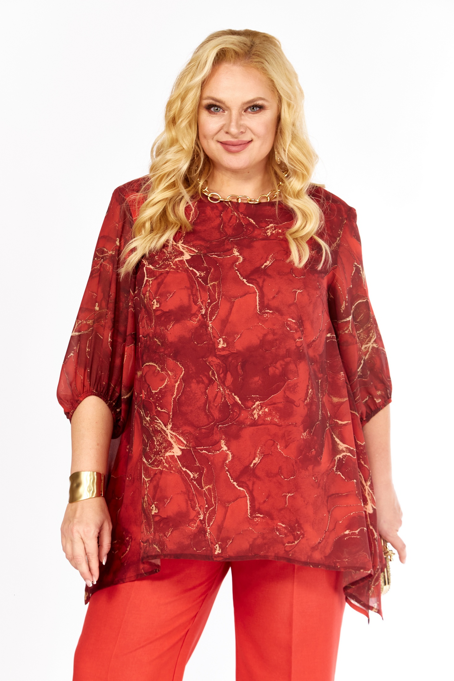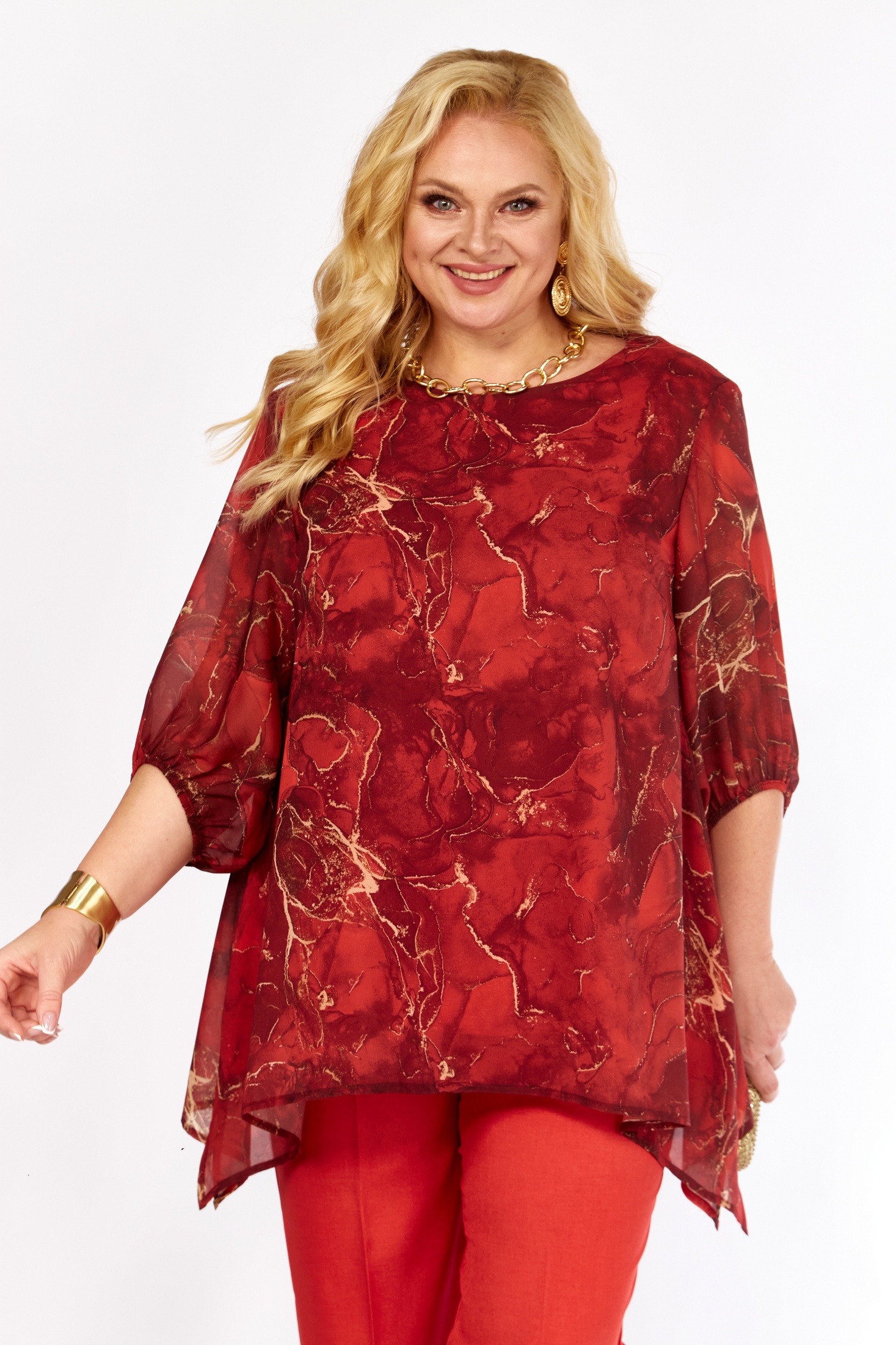 Элегантная блуза свободного кроя, выполненная из воздушного принтованного шифона. Насыщенный красный цвет ткани украшен стильным абстрактным принтом в оттенках золота и меди, что добавляет модели изысканности. Аккуратный округлый вырез горловины и нагрудные вытачки на полочке подчеркивают линию груди и обеспечивают идеальную посадку. Длинные втачные рукава и присборенный низ создают ощущение легкости и свободы. Эта блуза идеально подойдет как для офиса, так и для особых случаев.