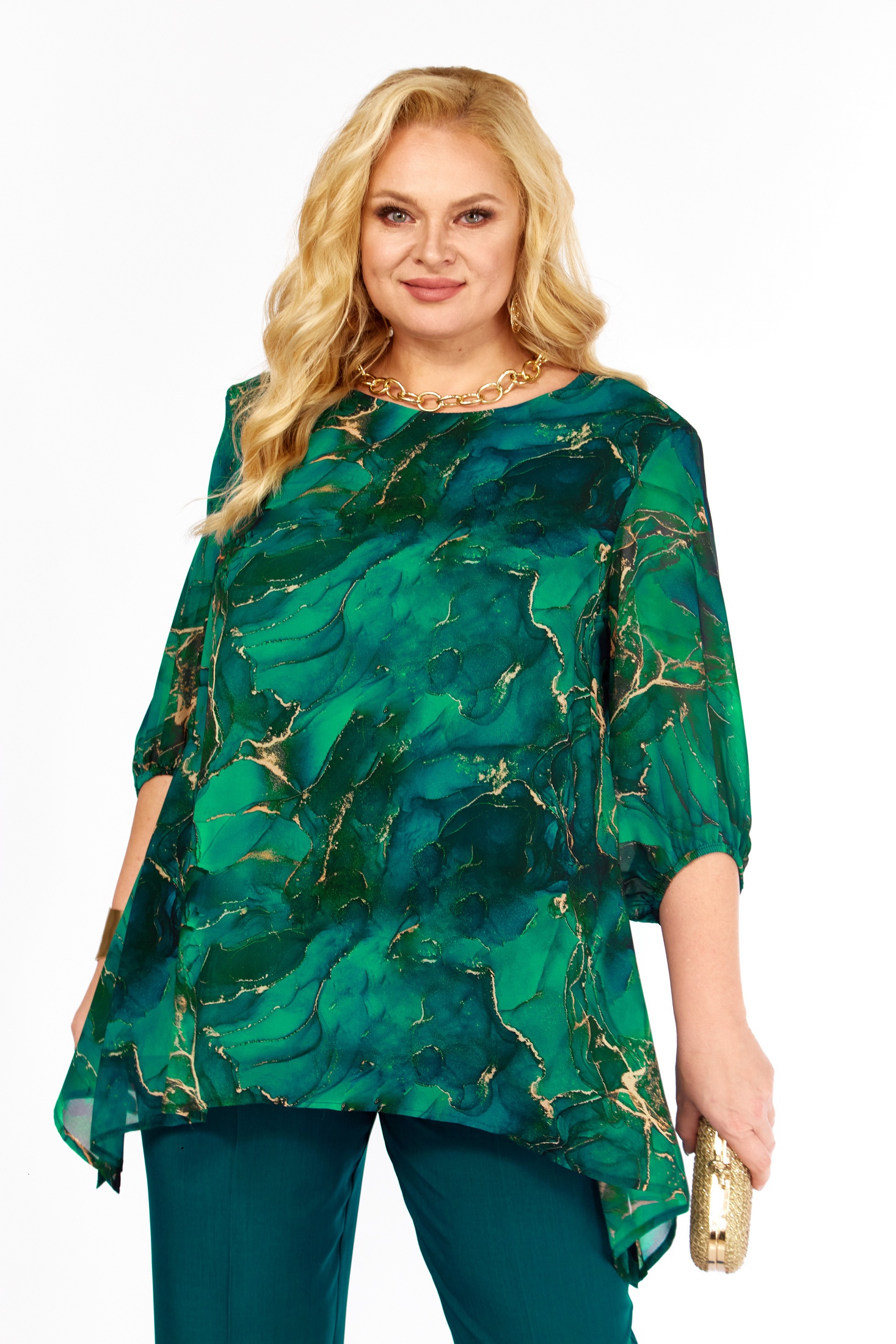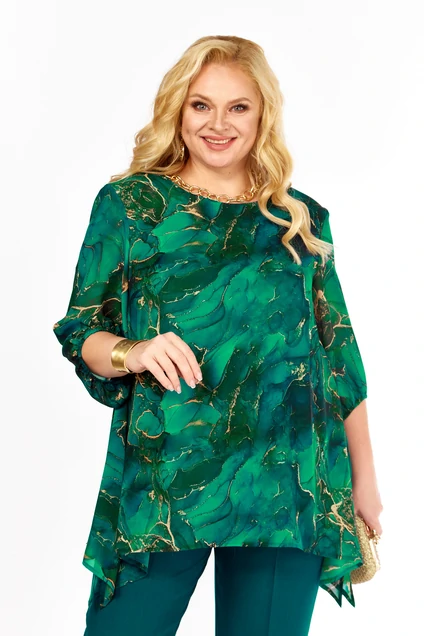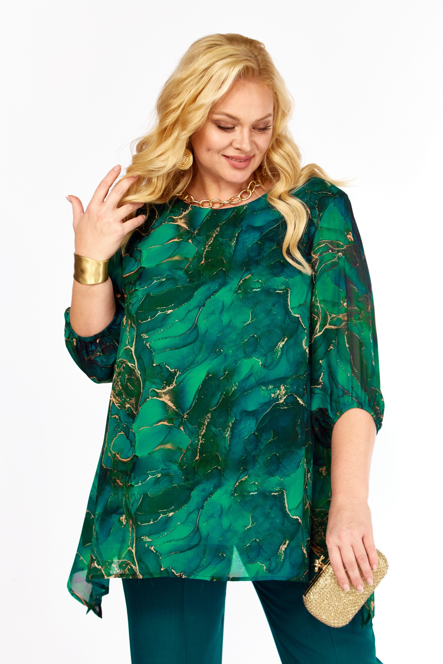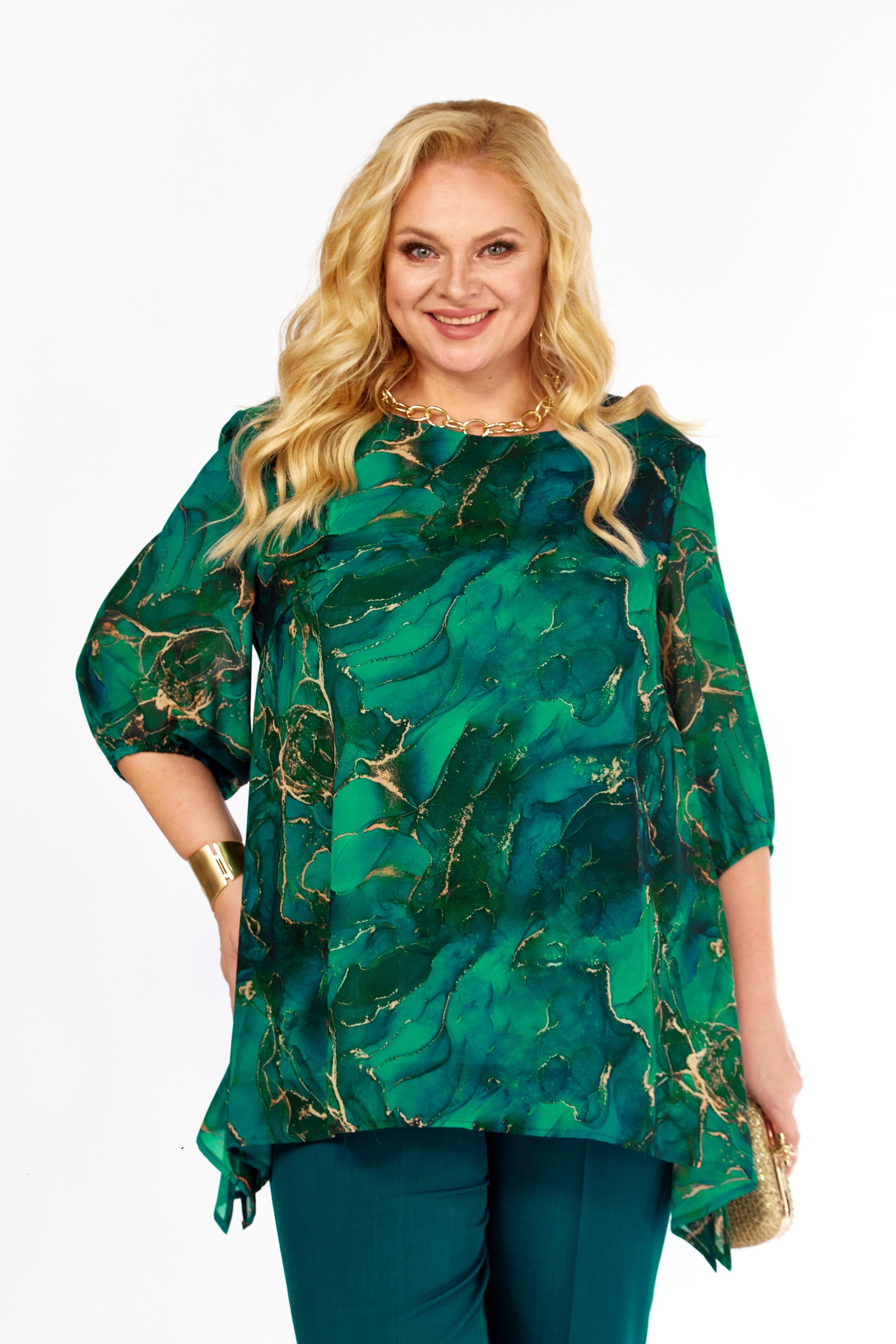 Эта изысканная блуза изготовлена из легкого шифона с ярким и креативным принтом в зеленых и золотых тонах, имитирующим разводы и линии, что делает каждый элемент уникальным. Дизайн включает в себя аккуратный округлый вырез горловины и изысканные нагрудные вытачки на передней части. Рукава длинные, втачные и свободного кроя, заканчивающиеся присборенным низом, добавляющим объем и легкость образу. Блуза свободного кроя отлично подойдет как для повседневных, так и для более торжественных мероприятий, обеспечив комфорт и несравненный стиль.