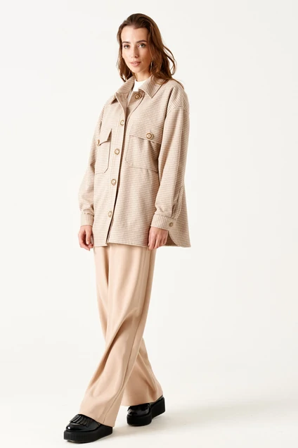 Рубашка женская, свободного покроя, длинной ниже линии бедер, из трикотажного полотна - "гусиная лапка". Перед с накладными карманами с клапаном, застежка планка на петли, пуговицы. Рукав втачной, длинный. Низ обработан обтачкой с фигурными разрезами по боковым швам.длина изделия - 74 см длина рукава от горловины - 75 см
