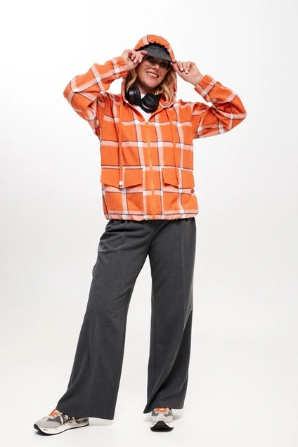 Блузон женский, свободного силуэта, длиной до линии бедер из блузочной ткани. Со спущенной линией плеча. Перед с накладными карманами с клапаном, центральной застежкой на декоративную молнию. Рукав одношовный, длинный, на цельнокроеной манжете на резинке. Низ изделия с цельнокроеным поясом на резинке. Блузон с капюшоном с декоративным шнуром. Длина 65 см, рукав 70 см.