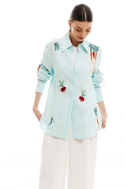 Блузка женская, полуприлегающего силуэта, длиной до середины линии бедер из плательно-блузочной ткани. Перед с нагрудными вытачками, декоративной вышивкой, с центральной цельнокроеной планкой и застежкой на петли, пуговицы. Низ блузки фигурный, в боковых швах разрезы. Рукав одношовный, втачной, длинный, на притачной манжете и застежкой на петли, пуговицы, с декоративной вышивкой. Воротник рубашечный, на отрезной стойке. Длина 71 см, рукав 62 см.