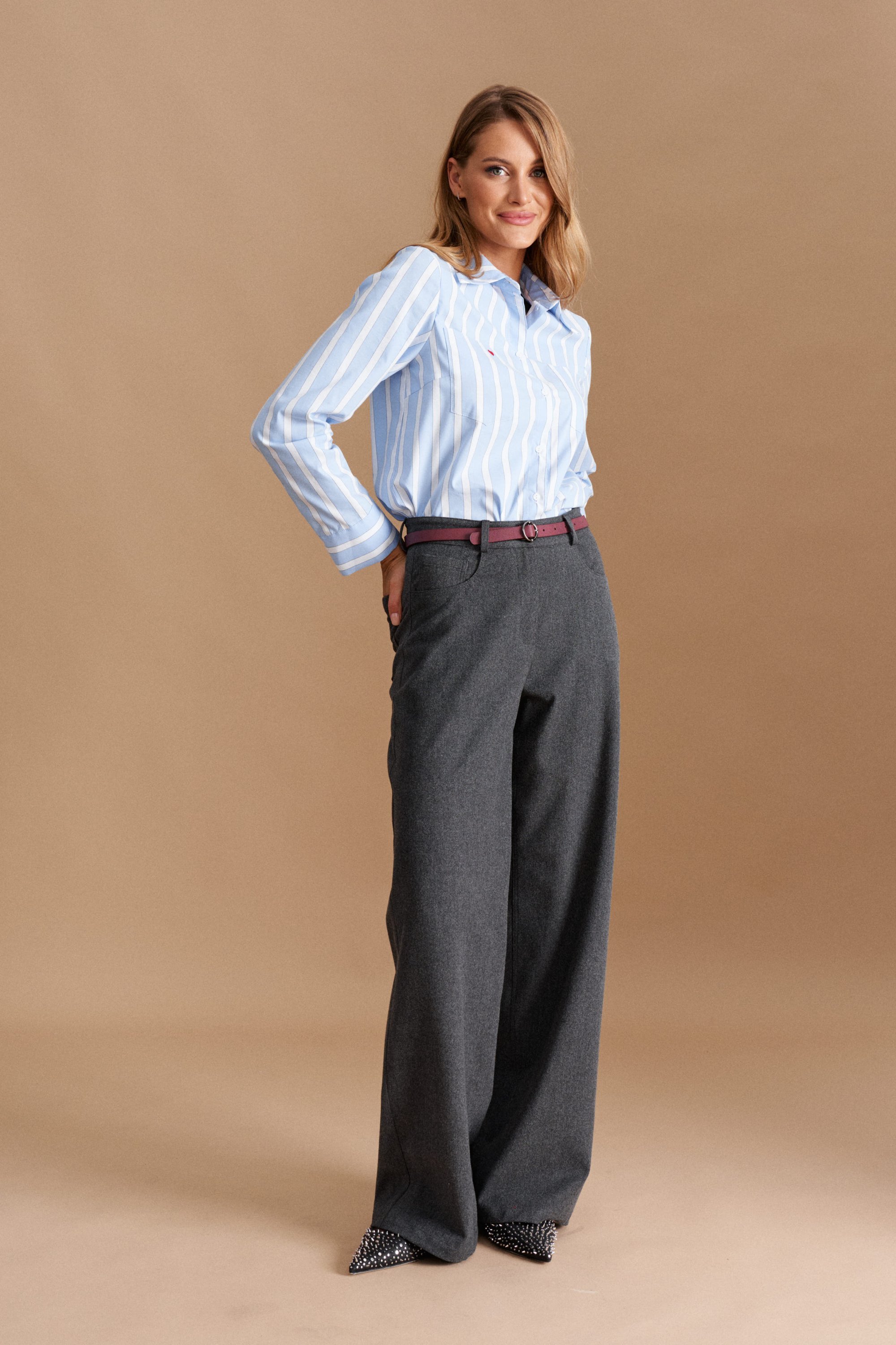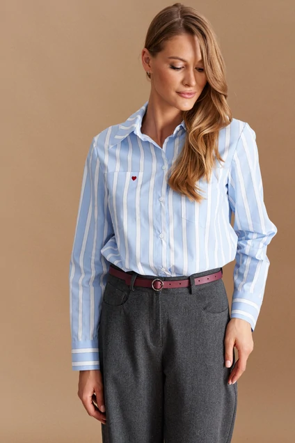 Блузка прямого силуэта из хлопковой ткани в полоску. Застежка фронтальная потайная на петли, пуговицы. По переду два накладных нагрудных кармана. Спинка с двойной отрезной кокеткой. Воротник отложной на стойке.Рукав длинный втачной, оформлен притачной манжетой. Карман и манжета декорированы вышивкой. Длина изделия до линии бедер.