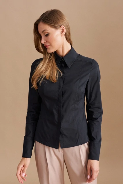 Блуза прилегающего силуэта из хлопковой ткани. Изделие с фронтальной застежкой на петли, пуговицы.По переду рельефные швы. Спинка с отрезной фигурной кокеткой, талиевыми вытачками. Воротник отложной на стойке. Рукав длинный втачной оформлен притачной манжетой. Длина изделия классическая.