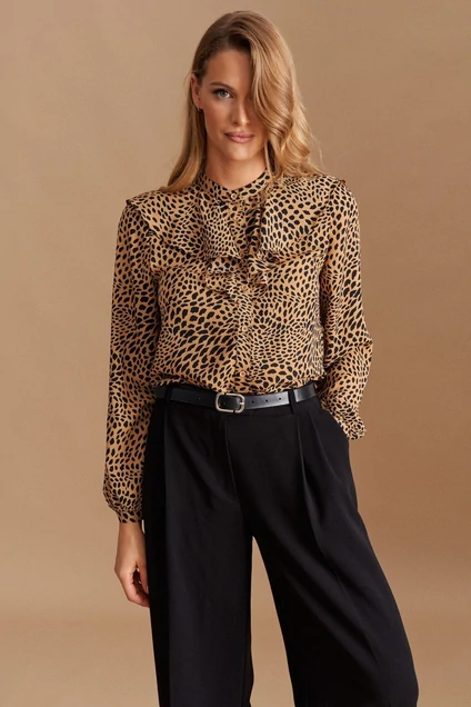 Блузка полуприлегающего силуэта из плательно-блузочной ткани. Застежка центральная на петли и пуговицы. Перед с нагрудными вытачками и притачной планкой, с декоративным валаном, входящим в плечевой шов, шов горловины и планки. Воротник-стойка. Рукав длинный втачной одношовный, присборенный на притачной манжет. Длина изделия до линии бёдер.
