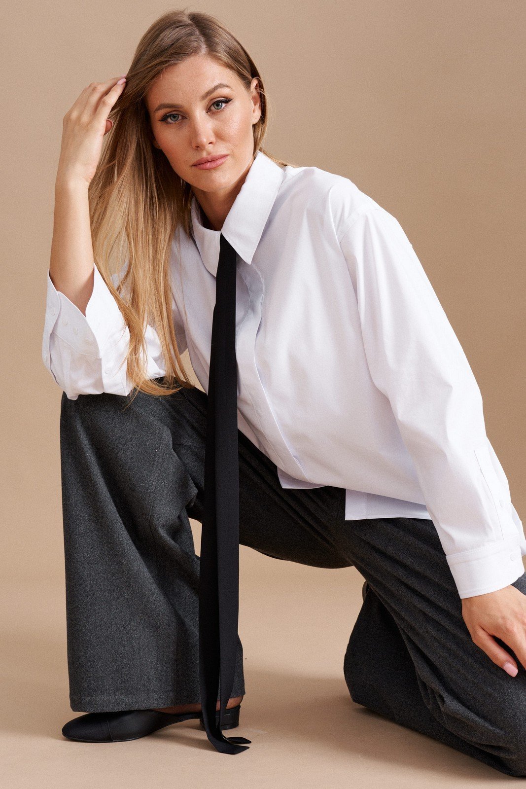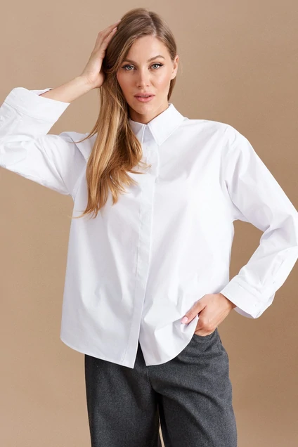 Блуза прямого силуэта свободного кроя из хлопковой ткани. Застежка фронтальная потайная на петли, пуговицы. Спинка с двойной отрезной кокеткой, защипами. Воротник отложной на стойке.Рукав длинный втачной, оформлен притачной широкой манжетой с двумя планками. Манжета регулируется по ширине. Длина изделия до линии бедер.