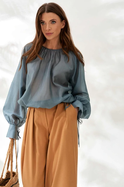 Блузка женская из воздушной вискозной ткани, прямая свободная с рукавом реглан, длиной до линии бедер. Перед цельный со сборкой по горловине. Спинка цельная с разрезом капелькой у горловины и застежкой на навесную петлю и пуговицу. По низу блузки в подгибку низа втянуты шнурки из основной ткани с выходом по боковым швам для затягивания. Рукав реглан одношовный, с вытачкой сверху, с разрезом внизу, на притачной манжете с завязками. Вырез горловины круглый, окантован косой бейкой.
