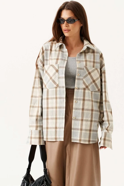 Блузка из тонкой ткани в классический клетчатый принт, выполненная в спокойных бежевых и белых тонах. Модель прямого, свободного кроя со стильным рубашечным воротником на притачной стойке и центральной застежкой на петли и пуговицы, добавляет изысканности в деловой или повседневный образ. Блузка украшена двумя симметричными накладными карманами на груди, что делает её не только стильной, но и функциональной. Длинные рукава завершаются отрезными манжетами с застежкой, обеспечивая возможность регулировки облегания. Блузка идеально подходит для создания элегантной и утонченной атмосферы в любом наряде.