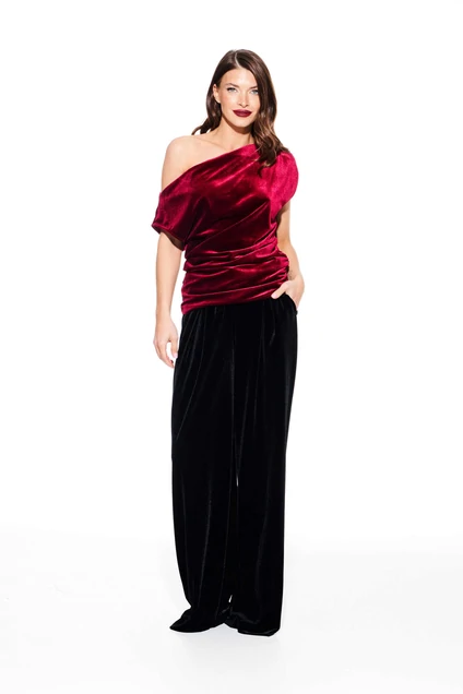 Элегантная блуза из мягкого бархата в насыщенном винном оттенке добавит изысканности вашему гардеробу. Изделие выполнено на трикотажной основе, что обеспечивает комфортное прилегание. Особенностью дизайна является асимметричный крой с акцентом на одно плечо и фигурной драпировкой на уровне груди, что придает образу нотку утонченности и современности. Вырез лодочкой элегантно обрамляет линию шеи, а сборки на левом плечевом и боковом швах добавляют объема и текучести силуэту. Блуза идеально смотрится в сочетании как с классическими брюками, так и с юбками, доходя до длины бедер для подчеркивания стройности фигуры.