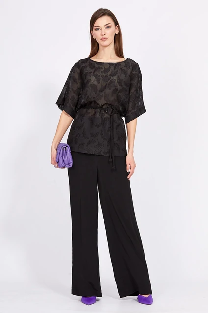 Блузка выполнена из плательно-блузочной ткани. Блузка прямого силуэта, длиной до линии бедер. Перед цельный. Спинка со средним шво Плечевой шов спущен. Горловина округлой формы. Рукав цельнокроенный, длиной выше линии локтя. Низ рукава на притачной манжете. В боковых швах разрезы. В комплект входит съемный пояс из декоративной тесьмы-шнура.