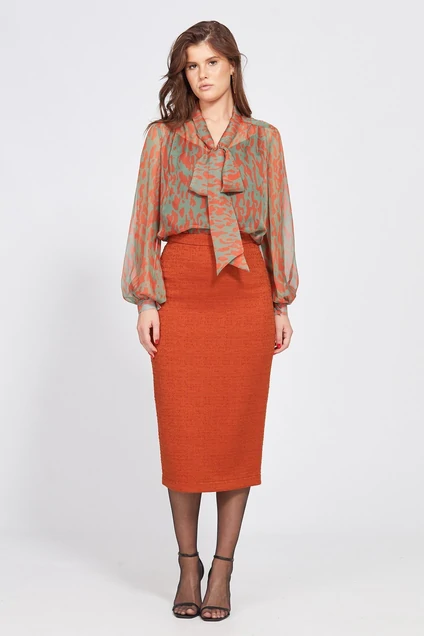 Комплект: блузка + топ. Блузка выполнена из плательно-блузочной ткани с принтом. По переду на кокетке. Рукав втачной расширенный к низу, присборен на манжет, с застежкой на две пуговицы. В боковых швах разрезы. Воротник на стойке, переходящий в завязывающийся бант спереди. Топ на регулируемых бретелях.