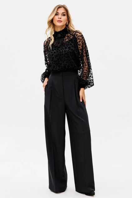 Блузка выполнена из фатина с анималистичным принтом. Блузка прямого силуэта, длиной до линии бедер. Перед и спинка цельные, со сборкой по горловине. Застежка сзади на две петли и пуговицы. Воротник-стойка декорирован рюшами по верхнему краю. Рукав покроя "реглан", одношовный, со сборкой по горловине и низу. Низ рукава на притачной манжете из велюра, застегивающейся на пуговицу. В комплект входит съемный топ на регулируемых бретелях, из атласа. Топ прямого силуэта, длиной до линии бедер. В комплект входит декоративная брошь.
