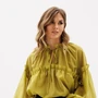 Блузка выполнена из шифона. Блузка прямого силуэта, длиной до линии бедер. Спереди средний шов и кокетка, V-образный вырез и завязки. Ни спинке кокетка. Воротник-стойка. Кокетка переда и спинки переходит на рукав. Рукав двухшовный, расширеный и присборенный к низу. Низ рукава на притачной манжете с застежкой на пуговицы. В боковых швах разрезы. Блузка декорирована оборками из основной ткани по линиям кокеток переда и спинки, и по верхнему шву рукава.