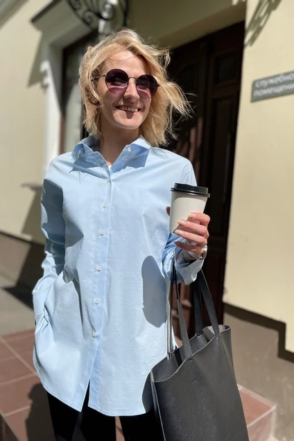Рубашка oversize в голубом цвете, с разрезами по бокам.