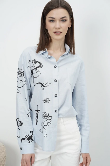 Независимо от вашего стиля одежды и предпочтений обойтись без трендовой модели рубашки очень сложно, ведь она помогает превосходно завершить тандемы с многими вещами из вашего гардероба. Рубашка из льняного полотна, свободного покроя с авторским принтом неординарна и великолепно сочетается с джинсами, шортами и свободными брюками. Покрой - рубашечный, силуэт - свободный, застежка центральная. Рукав с притачной манжетой и разрезом. На левой полочке накладной карман. Воротник классический рубашечный. Длина рубашки около 72 см. Длина рукава с плечом около 72 см.