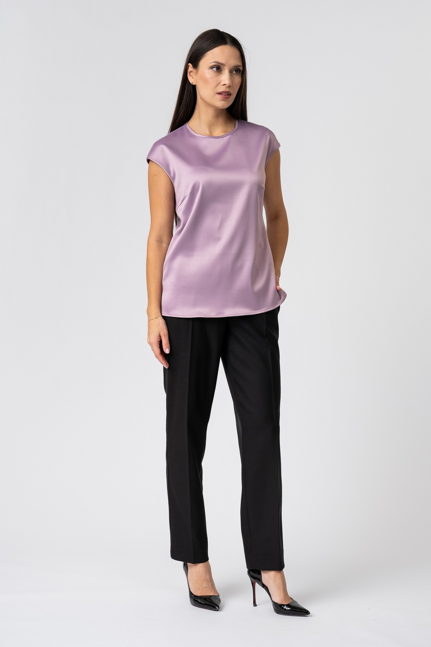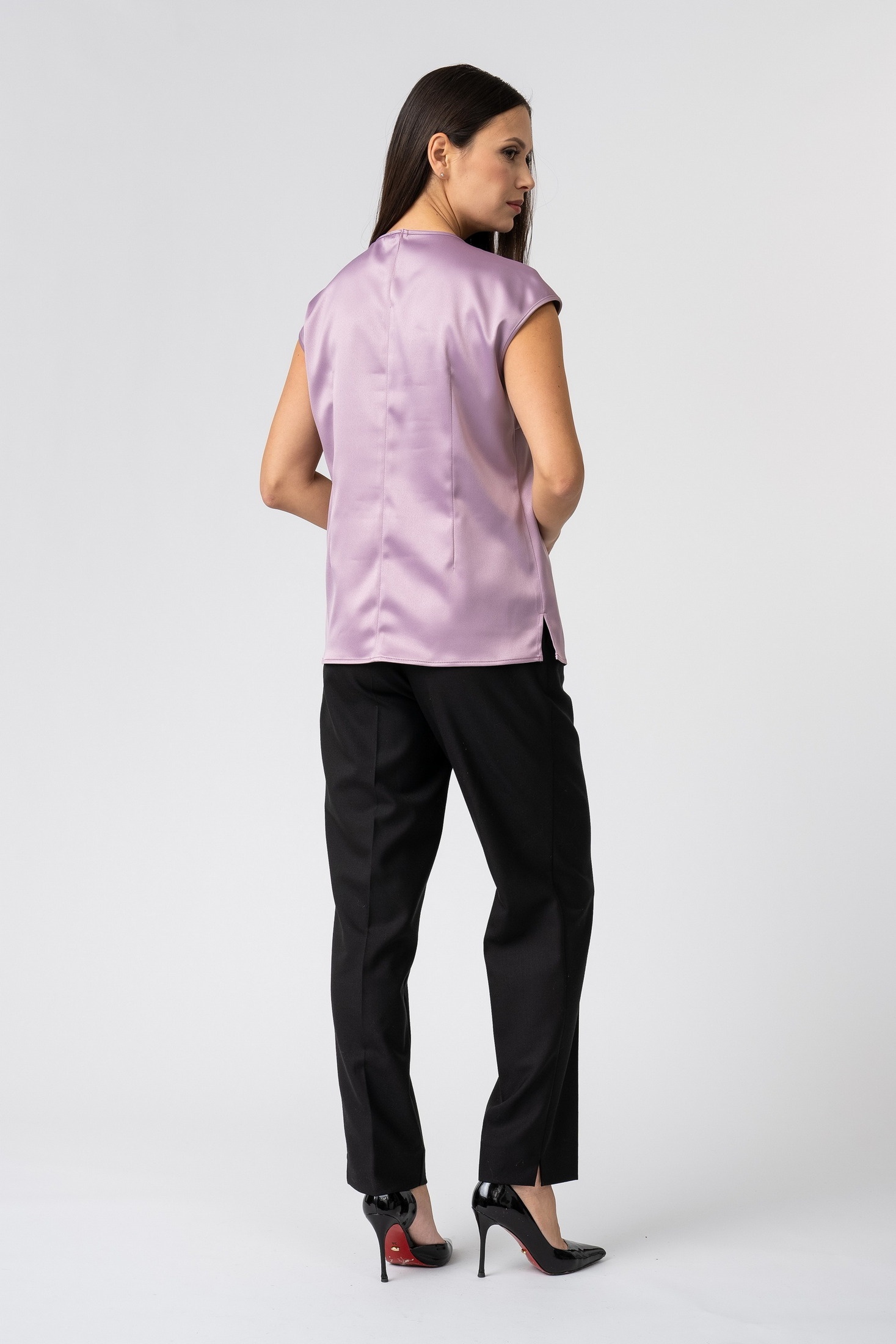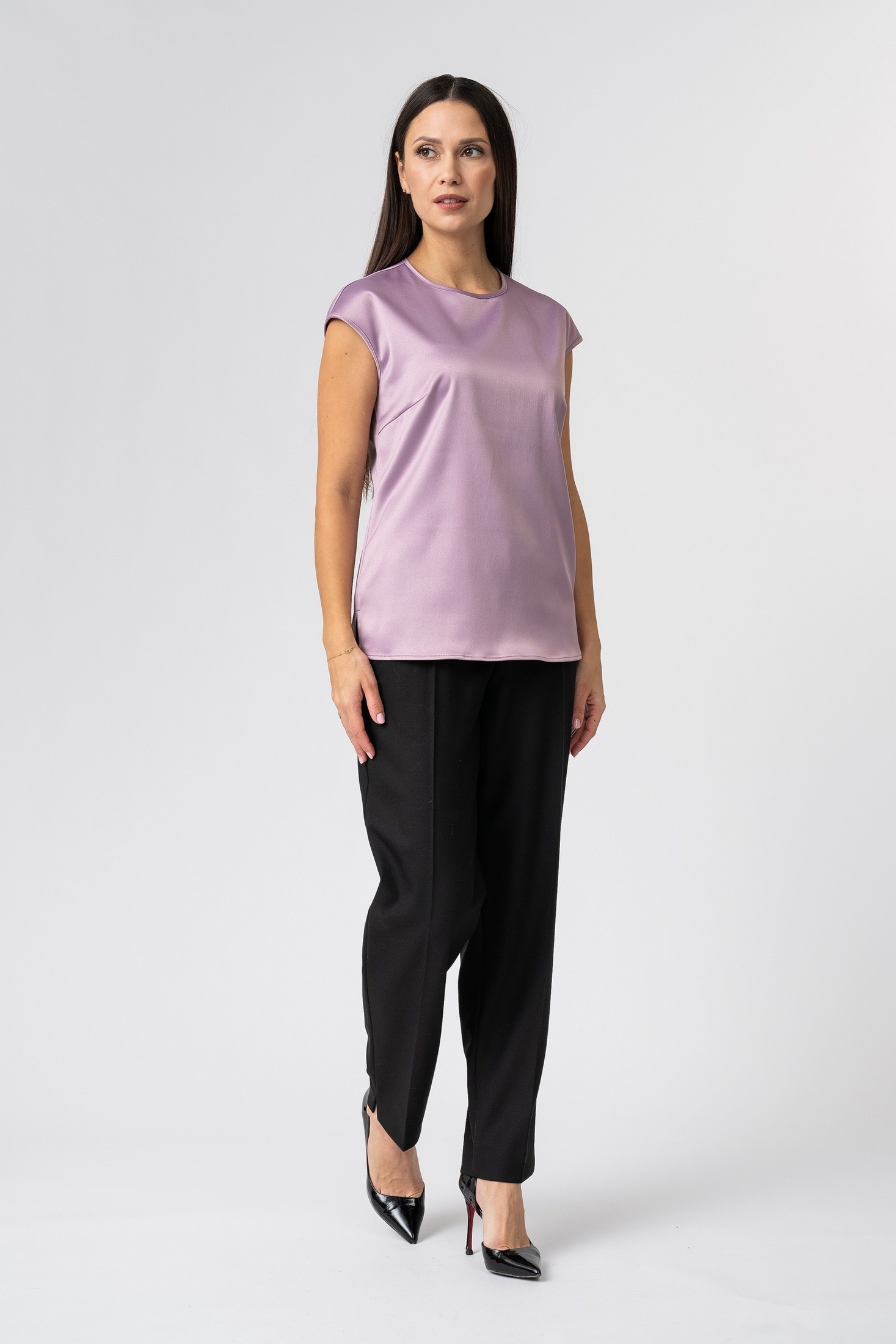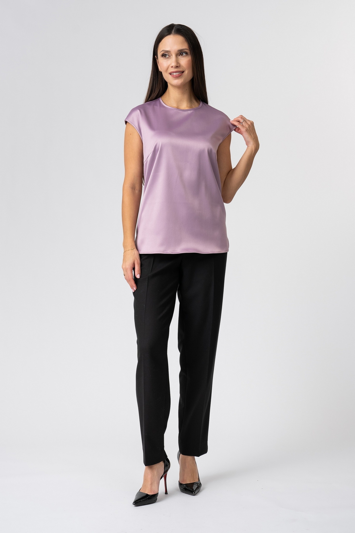 Блузка женская, полуприлегающего силуэта с круглой горловиной без рукавов. Застежка по разрезу середины спинки на одну пуговицу и навесную петлю. Плечо слегка спущенное