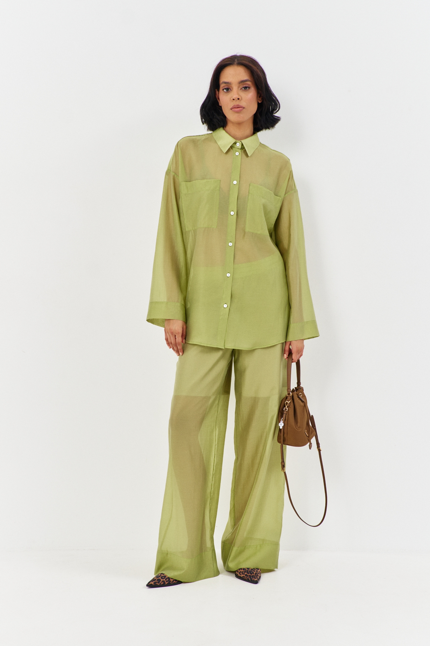 Блузка свободного силуэта с карманами по переду. Характеристики: выполнена из блузочной ткани в цвете фисташки, центральная застежка на петли и пуговицы, по спинке отрезная кокетка. Длина рубашки по переду 79 см, длина рукава 53 см.