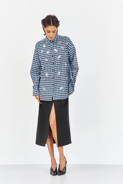 Рубашка в клетку с декоративной вышивкой. Характеристики: свободный силуэт, выполнена из фланелевой рубашечной ткани в черно-голубую клетку, центральная застежка на петли и пуговицы, по спинке отрезная кокетка и складка, по переду декоративная вышивка, низ рукава обработан манжетой на петли и пуговицы. Длина рубашки 80 см, длина рукава+плечо 78 см.