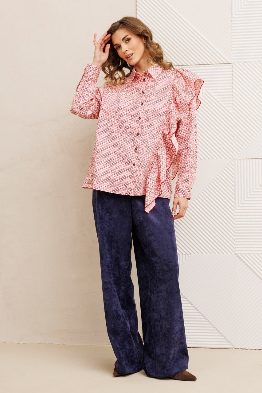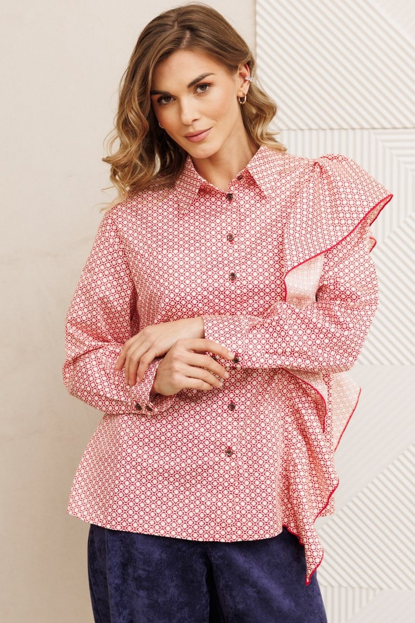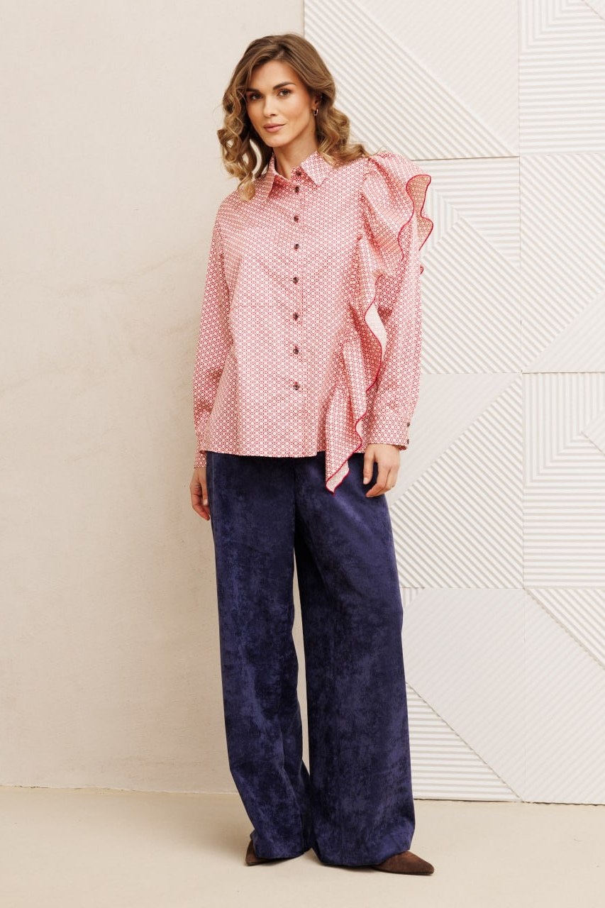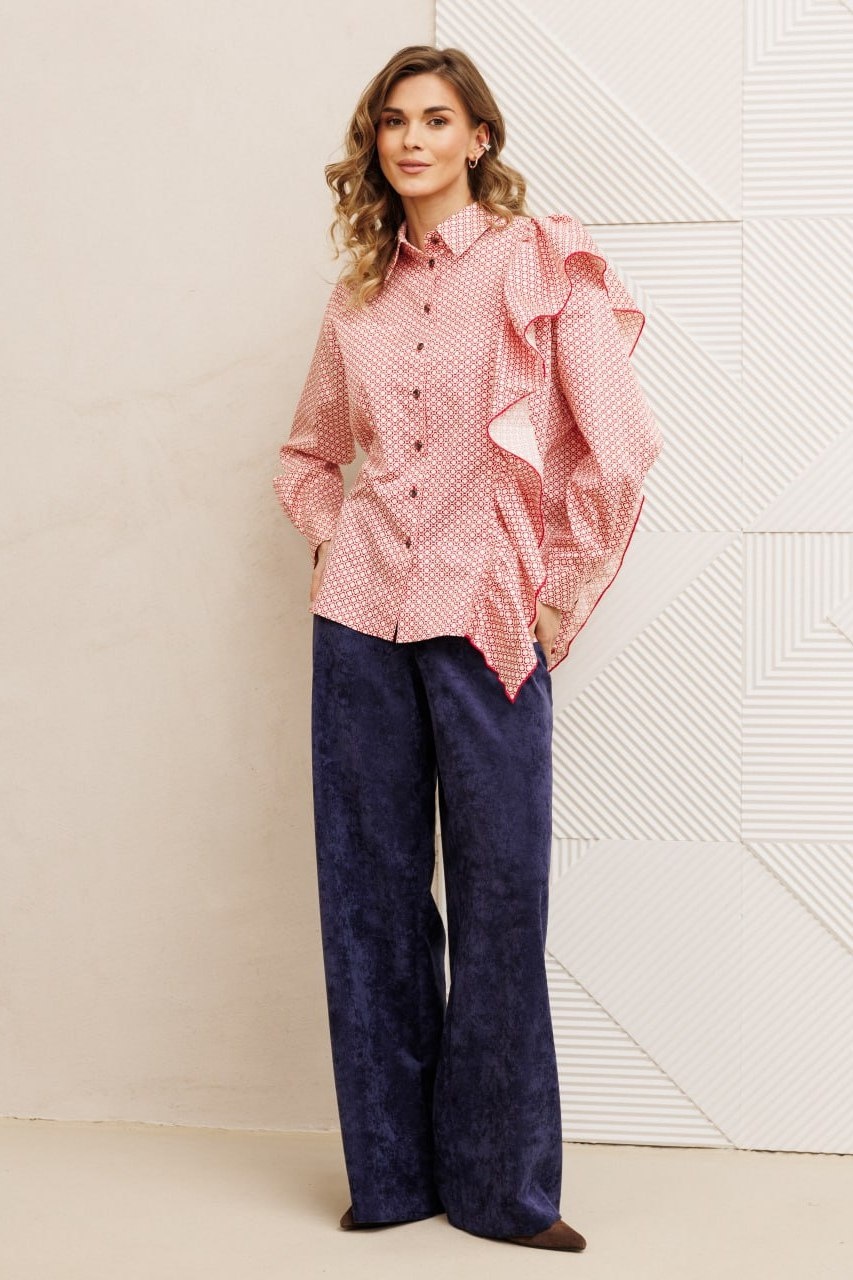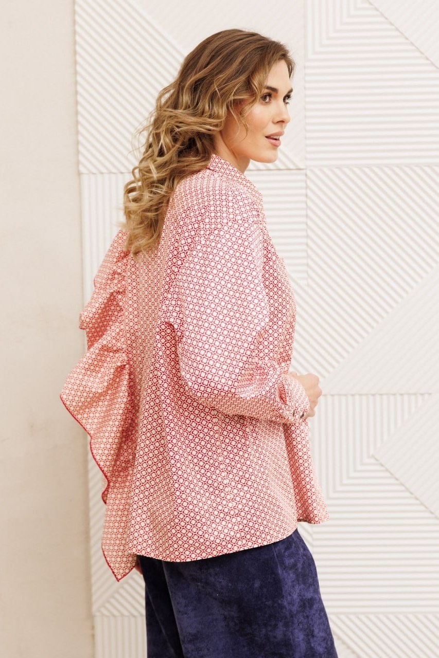 Рубашка прямого силуэта выполнена из хлопковой ткани с оригинальным жаккардовым переплетением. Перед с центральной застежкой потайной планкой. Левая часть переда и спинка с воланом на сборке вставленном в рельеф. На правой части переда настрочен карман. Рукав втачной одношовный с манжетой по низу, на манжете застежка на 2 петли и пуговицы. Воротник отложной со стойкой. Длина рубашки - 65 см, длина рукавав рубашки - 53 см.