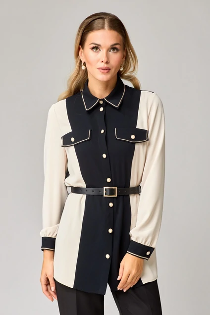 Блузка прямого силуэта из плательной ткани 2-х цветов. По переду центральная застежка. Воротник со стойкой. Перед с рельефами и декоративными клапанами. Рукав втачной одношовный. Низ рукава собран на манжету с застежкой на петлю и пуговицу. По клапану, воротнику и манжете настрочена отделочная тесьма. Спинка, манжеты, воротник, внутренние части переда выполнены из ткани черного цвета. К блузке прилагается ремень из кожзама с металлической пряжкой. Длина блузки: 73 см, длина рукава: 61 см.