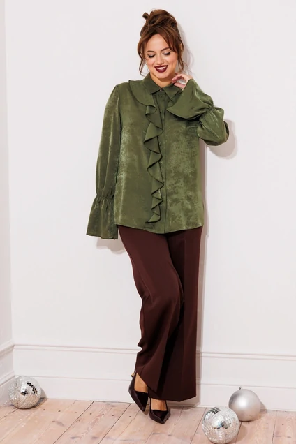 Блузка свободного силуэта выполнена из блузочного атласа с эффектом замши. Перед с нагрудной вытачкой. Застежка центральная с отрезной планкой на петли и пуговицы. Воротник со стойкой. В правой части переда в планку вставлена рюша. Рукав втачной одношовный со сборкой на резинку в нижней части с образованием волана. В боковых швах разрезы. Пуговица на стойке декоративная. Фурнитура может быть изменена с сохранением художественного образа. Длина блузки - 68 см, длина рукава блузки - 64 см.